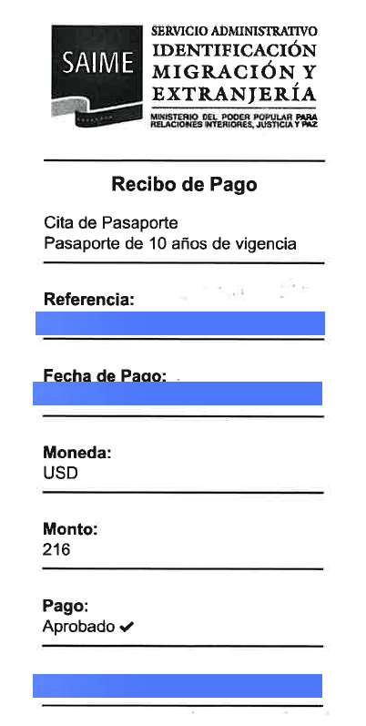 Si no le ha llegado el recibo de Pago del SAIME al hacer el pago por BANCA AMIGA, deberá solicitarle a su banco (de su tarjeta de pago) una CERTIFICACIÓN BANCARIA DEL PAGO, donde confirme que el pago se hizo efectivo para el SAIME (Destinatario).