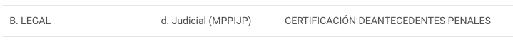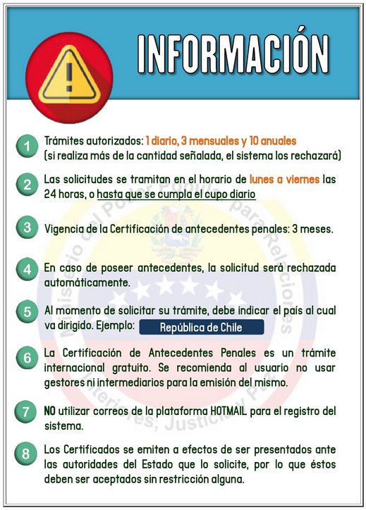 Le corresponde al interesado/a tramitar su solicitud en el Ministerio del Poder Popular para Relaciones Interiores, Justicia y Paz, de la Certificación de Antecedentes Penales, en su página http://www.mpprijp.gob.ve/, en la opción de: Servicio a la Ciudadania - Certificación para Trámites Internacionales, que puede conseguir a través del siguiente enlace: