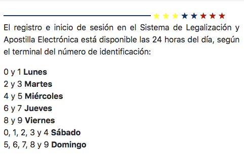 Una vez que el usuario ha obtenido su Certificado electrónico de Antecedentes Penales, deberá solicitar la apostilla del referido documento en el Sistema de Legalización y Apostilla Electrónica (SLAE) del Ministerio del Poder Popular para Relaciones Exteriores, ingresando en el día que le corresponde según el terminal de su número de cédula. (Ver el siguiente enlace)